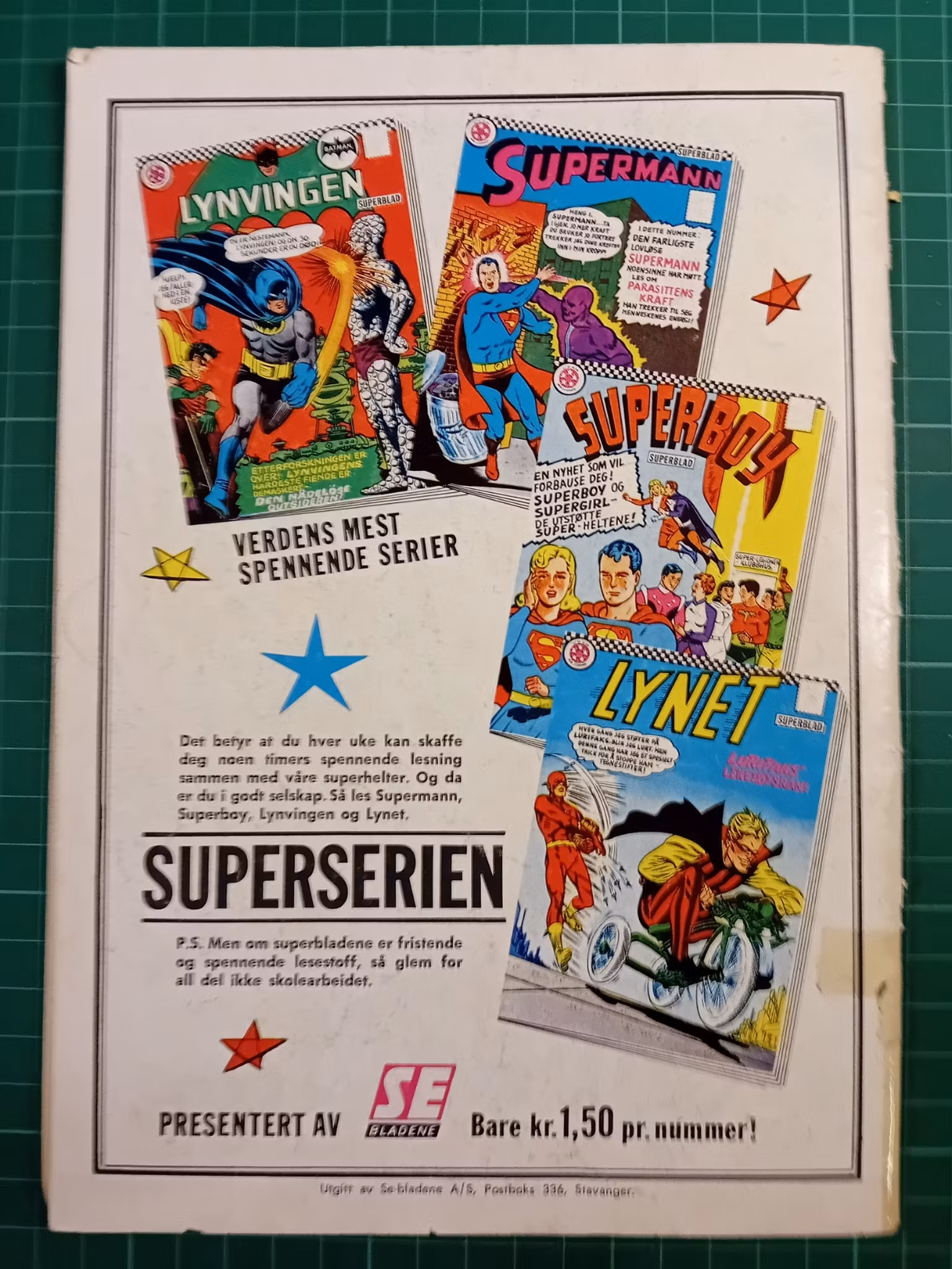 Lynvingen 1968 - 02 (Slitt) 40,- Ikke på lager hos Dippy Artikkelnummer: 77216 Del Informasjon Tilbakemeldinger FormatseriebladGraderingEn del slitasjeMerknaderStørre rift i cover. rufsete rygg, men tape reparert splitt