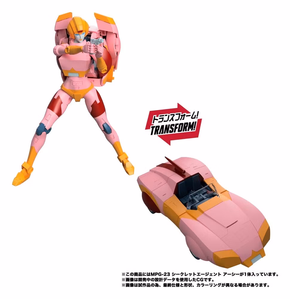 Bring the ultimate Transformers experience to your collection with Takara Tomy Transformers MPG-23 Secret Agent Arcee figure set. These collectible Transformers action figures for adults feature deco and details inspired by the fan-favorite Autobot and Decepticon characters. Arcee converts between car and robot modes. Comes with accessories for customizing your display, including laser guns, laser rifle, crusher, holster, replacement faces, and effect parts. Figure set comes in its original packaging with Japanese-language instructions.