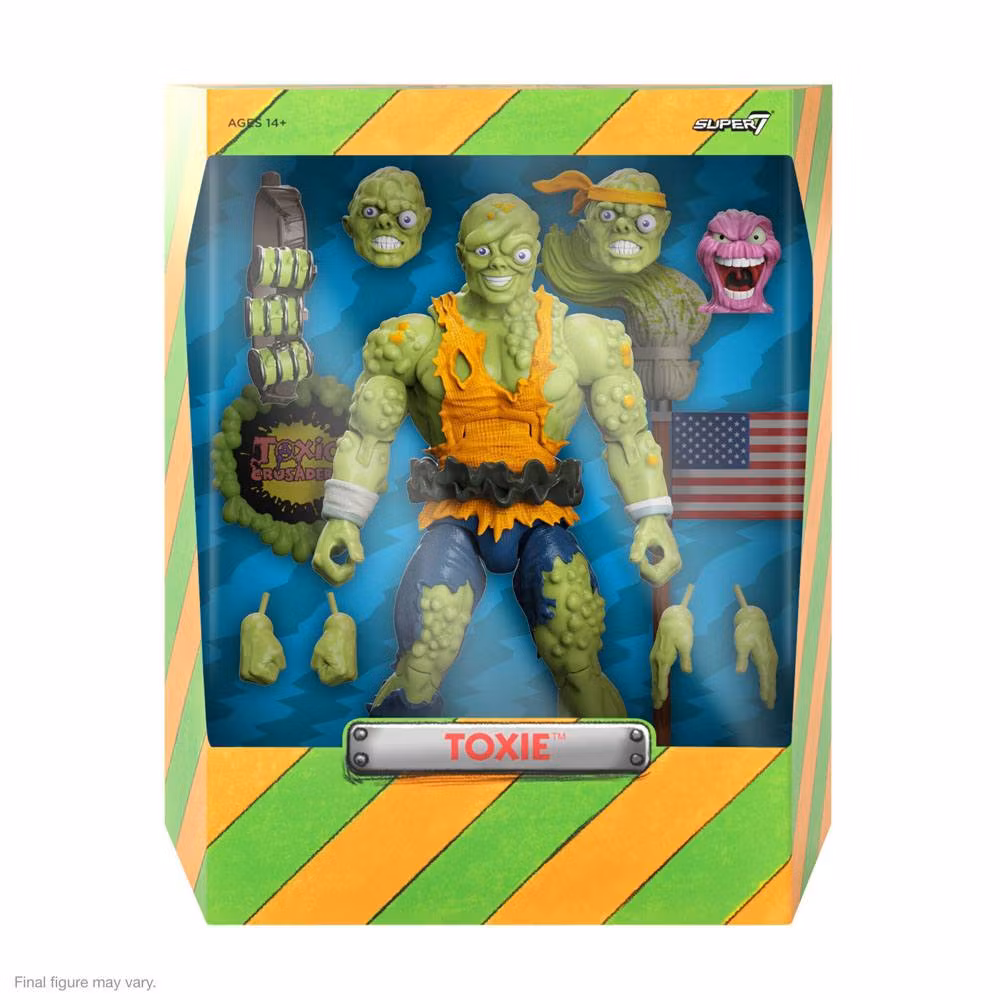 When a prank-gone-wrong exposes wimpy janitor Melvin Junko to toxic pollution, he's transformed into Toxie, a green grimefighter with superhuman size and strength who uses his newfound powers to protect Tromaville from pollution and evil aliens alike! This 7" scale highly articulated Toxic Crusaders ULTIMATES! figure of Toxie is inspired by the early '90s animated series and comes with interchangeable heads & hands, the tutu he was wearing at the time of his transformation, his pet Blobbie, loyal superpowered Mop, and additional accessories. The made-to-order Toxic Crusaders ULTIMATES! figure of Toxie is ready to fight for decency and honor, as well as protect your collection from the toxic plots of Dr. Killemoff!