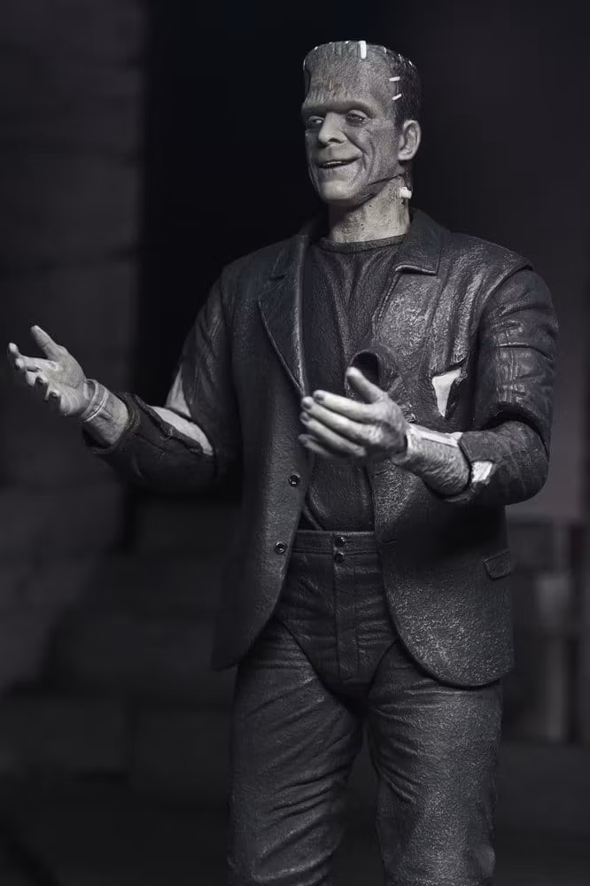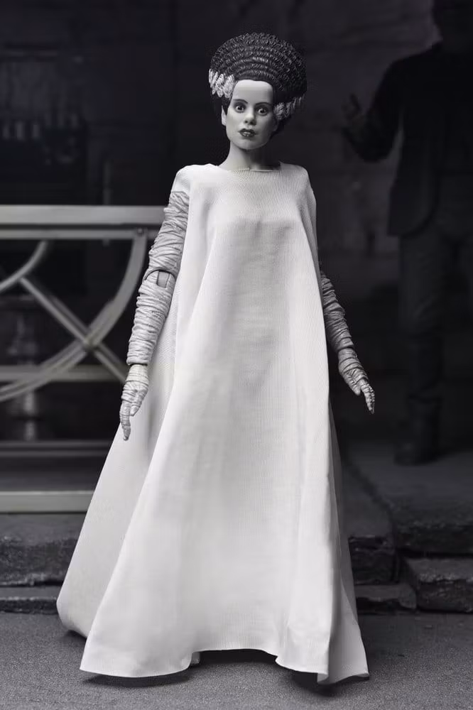 "We belong dead..." Celebrate over 90 years of horror and doomed romance with this haunting tribute to the classic Universal Monsters film, The Bride of Frankenstein! NECA proudly presents a commemorative action figure 2-pack that brings Frankenstein’s Monster and his Bride together in one electrifying collector’s set. When the Monster meets his true love and finds that his feelings are unrequited, he flips the switch that implodes the castle—ending their tragic love story before it even begins. Featuring black and white deco, looking as if they just stepped off the silver screen, these 7-inch scale figures include multiple interchangeable heads and hands, and a soft goods robe for the Bride. Bring home this infamous couple, together at last in limited-edition window box packaging with slipcover. Size: 17.8 cm (7.00")