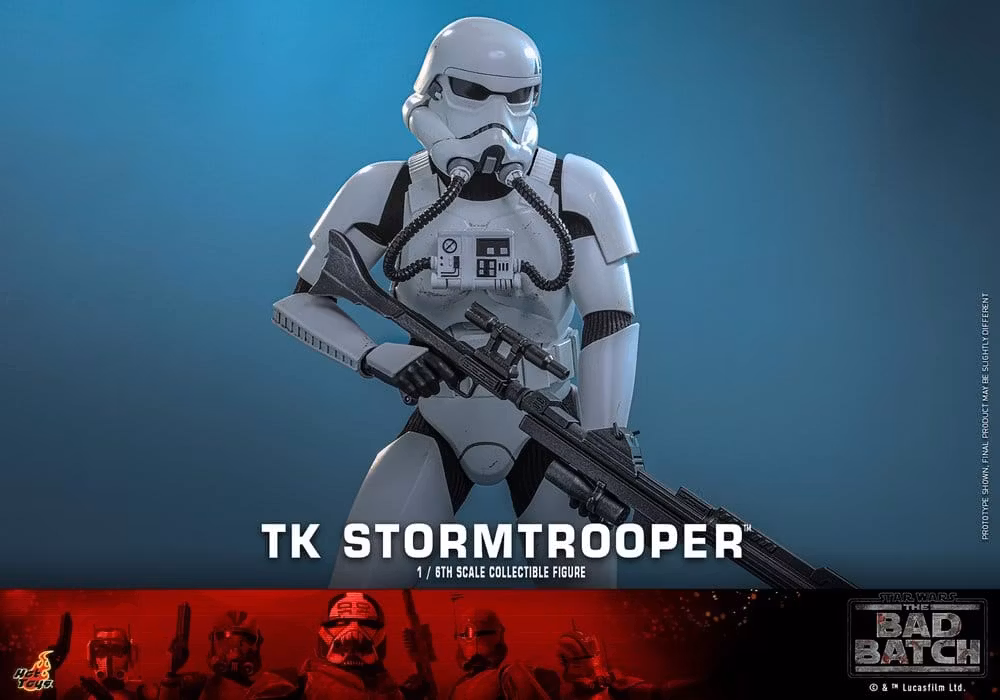 Sideshow and Hot Toys is excited to present the TK Stormtrooper™ Sixth Scale Collectible Figure. The action figure features a newly crafted TK Stormtrooper helmeted head with realistic weathering effects. The costume features a newly crafted set of white and weathered TK Stormtrooper armor, a fabric undersuit, a utility belt, and a pair of boots - all authentically recreated to capture the worn, early-era aesthetic seen in The Bad Batch.