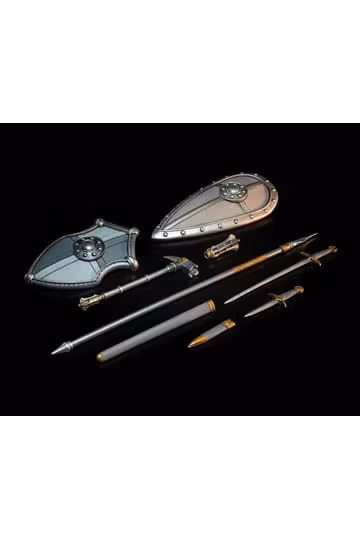 This set includes 2 shields, sword with scabbard, dagger with scabbard, and hammer/mace combo.