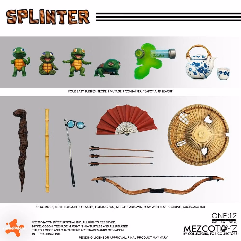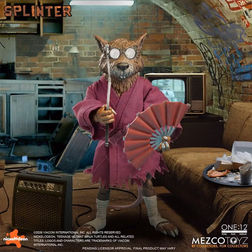 The wise and formidable mentor of the Teenage Mutant Ninja Turtles enters the One:12 Collective! Master Splinter, a legendary martial artist and spiritual guide, emerges with interchangeable portraits, layered soft goods, and a carefully curated assortment of weapons and personal effects. From calm contemplation to battle-ready resolve, Splinter’s expressions capture the many faces of a master who has trained his students in both combat and discipline. Splinter is equipped for both meditation and defense. His arsenal balances tradition and precision—featuring a shikomizue that conceals a blade, a yumi bow with arrows, and a flute befitting moments of reflection. A wide selection of interchangeable hands allows for expressive posing, whether teaching, striking, or standing guard. Once a devoted martial artist transformed by fate, Splinter retreated to the shadows to raise and train 4 extraordinary students. From his quiet sanctuary, he prepares the Turtles for the battles ahead—instilling patience, honor, and the strength to face the darkness of the world above.