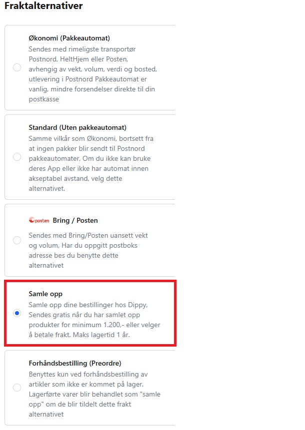 - Om det er ønsket å få tilsendt dine samle opp bestillinger innen grensen på 1200,- er nådd, så ta kontakt med kundeservice, så sendes bestillingene så fort betalingen for frakt er mottatt.