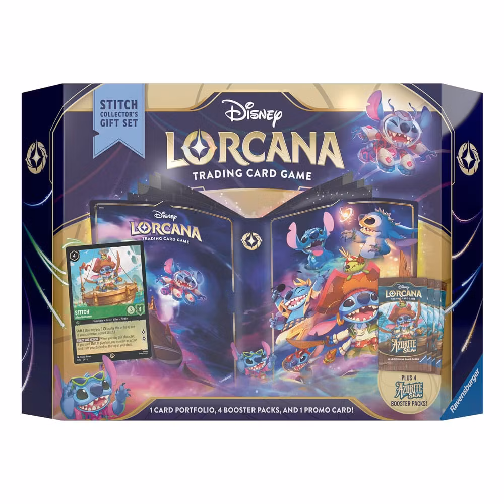 Swapping his surfboard for a pirate ship, Stitch is ready to sail to your home with such riches as a Stitch - Alien Buccaneer promo card, 4 Azurite Sea booster packs, and a portfolio decked out with Stitch in his many glimmer forms